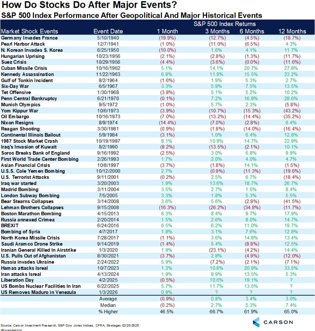 To put this in context, the chart located below illustrates just how stocks perform after seemingly cataclysmic events. (Source: Carson Investment Research, S&P Dow Jones Indices, CFRA, Strategies 02/20/2026.